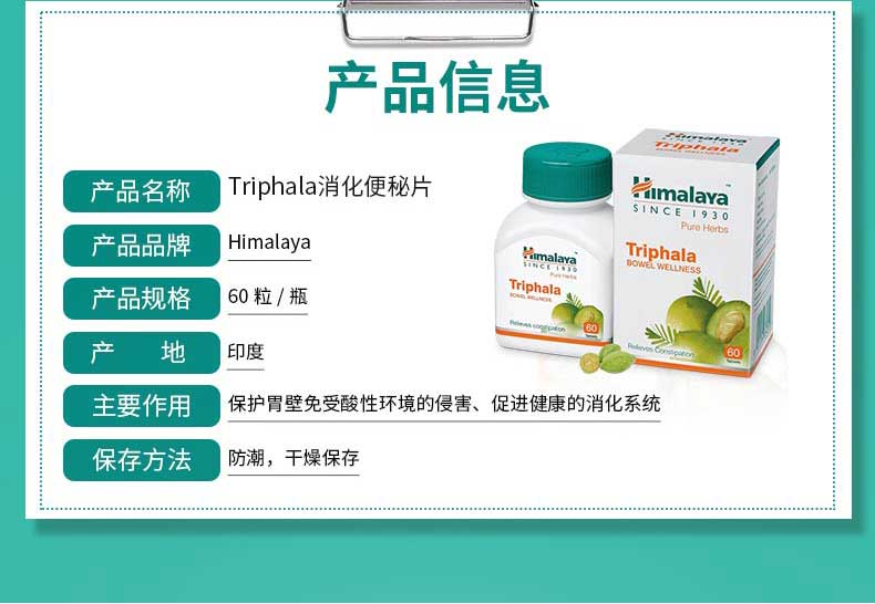 品牌:Himalaya名称:Himalaya Triphala 消化便秘片规格:60粒/瓶产地:印度适用人群:成人使用建议:每日1次,每次1粒,餐后服用储存方式:25摄氏度以下储存。密封盖若破损,请勿服用主要作用:保护胃壁免受酸性环境侵害,促进消化系统健康